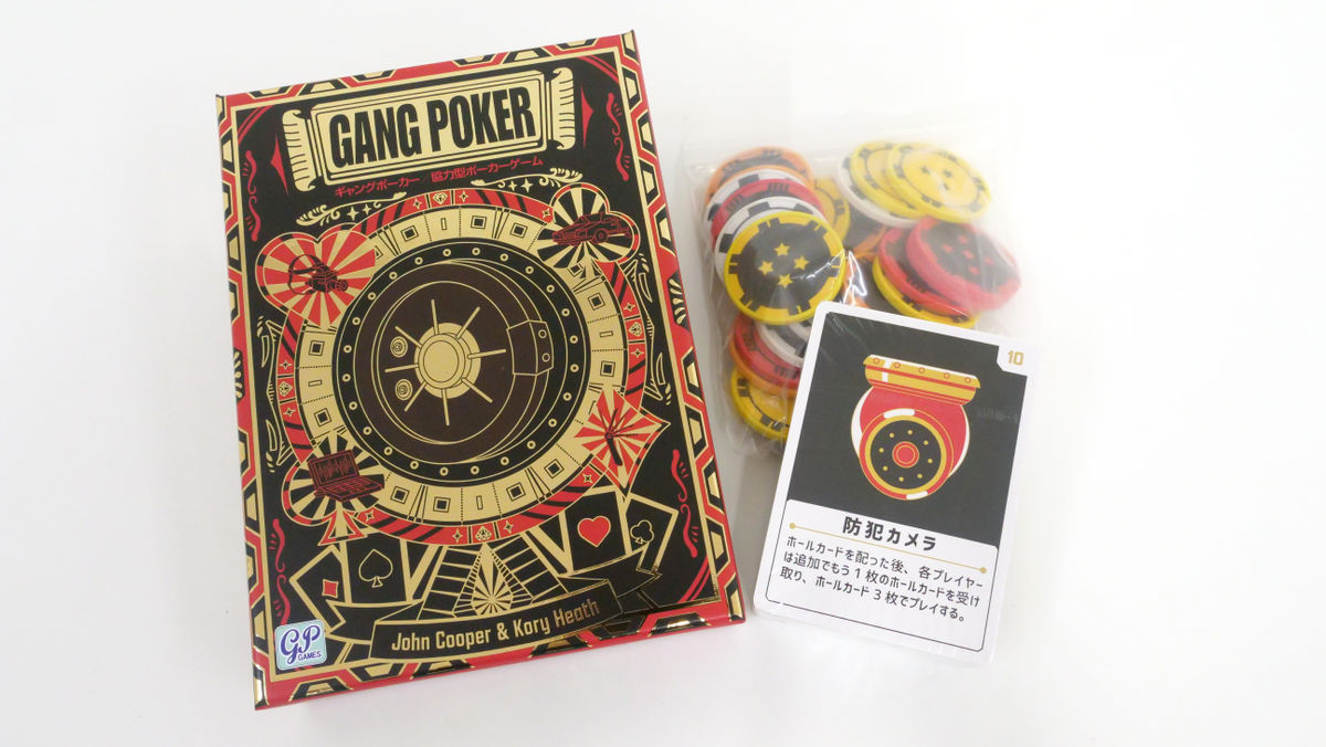 「テキサスホールデム」をベースにしつつ、「ギャングによる金庫破り」を題材に対戦型ではなく協力型に仕上げた新感覚ポーカーゲームです。ジーピーから提供してもらいました。プレイ人数は3~6人、プレイ時間は約20分、対象年齢は10歳以上です。