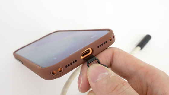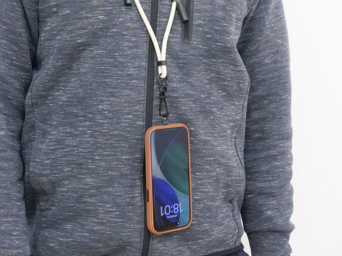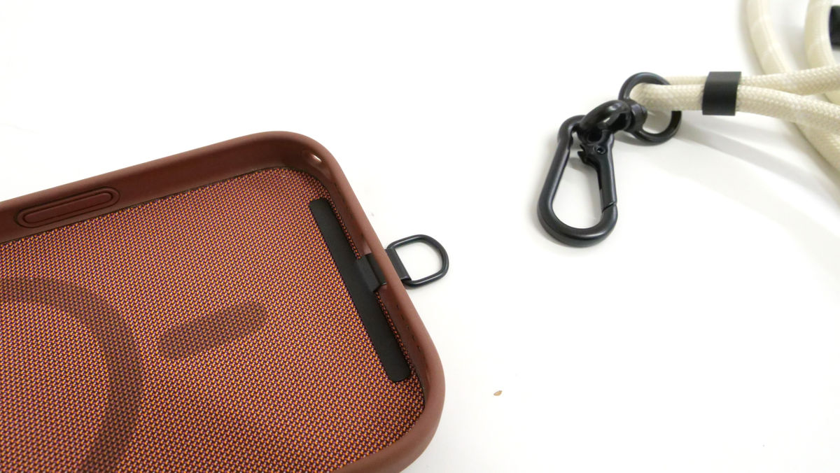 使うには別途スマートフォンケースが必要。「iPhone 17 Pro」とAppleの専用ケースで試しに装着してみます。まずはケース下部の穴にストラップのパーツを通します。