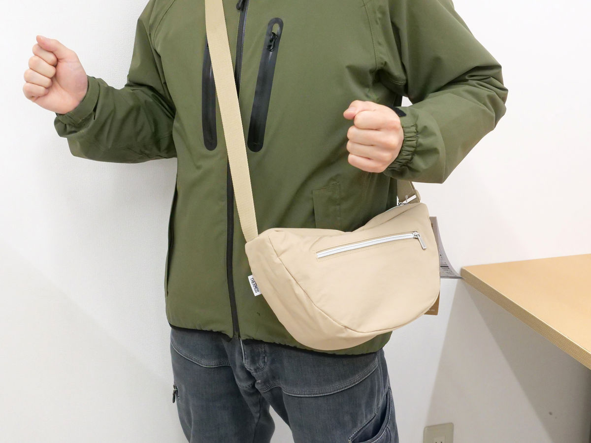 実際に提げてみました。両サイドにポケットがあり、ちょっとした小物などを入れておけます。
