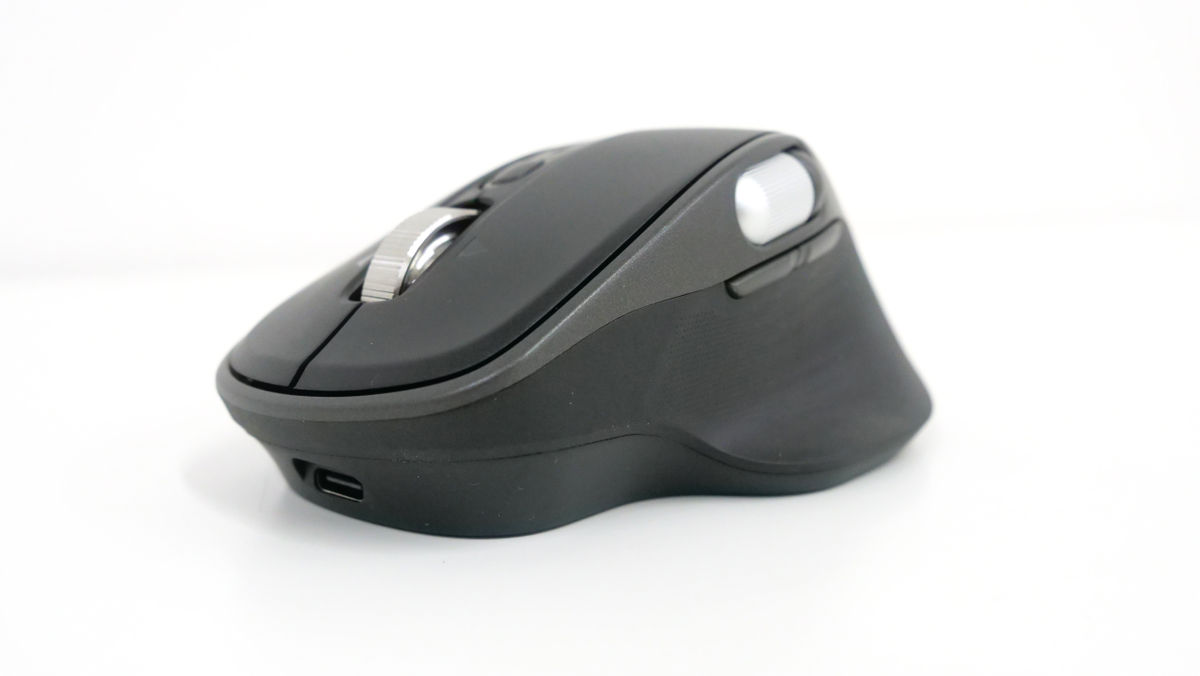 正面から見るとこんな感じ。充電式で、USB Type-Cポートから充電できます。接続はBluetoothまたは付属のレシーバーを使った2.4GHzワイヤレスに対応しています。