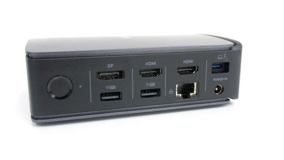 ポート類はこんな感じ。左上から右下に向かってDisplayPort(4K 60Hz)、HDMIポート(4K 60Hz)×2、USB-Cアップストリームポート(10Gbps・100W)、USB-Aポート(480Mbps・最大2.5W)×2、イーサネットポート(1Gbps)です。イーサネットポートの右にあるのは最大140W入力対応のDC入力ポート。