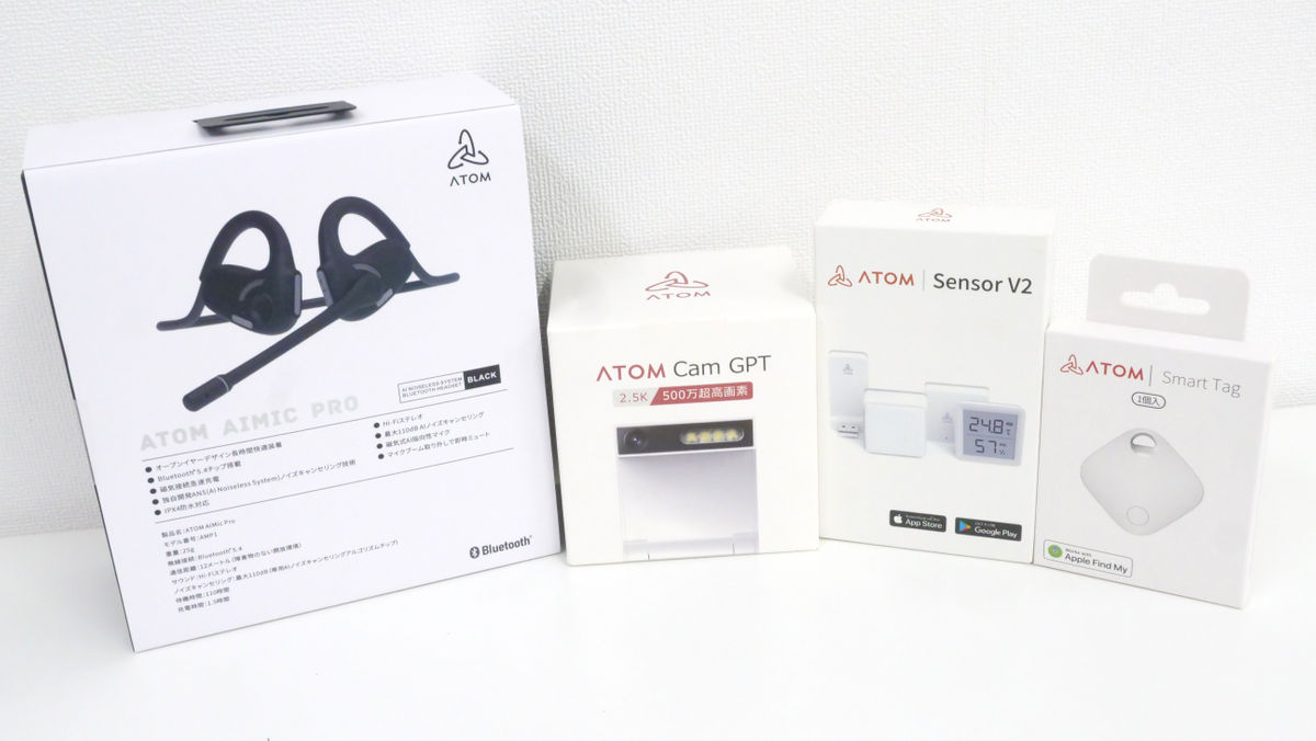 着用者の声だけをAIで届けるENCノイズキャンセリング搭載ヘッドセット「ATOM AIMic Pro」、AIで映像を要約するカメラ「ATOM Cam GPT」、モーションセンサー&開閉センサー&温湿度センサーがそれぞれ入った「ATOM Sensor V2」、落とし物タグの「ATOM Smart Tag」の4品を1セットにして合計2名にプレゼントします。アトムテックから提供してもらいました。