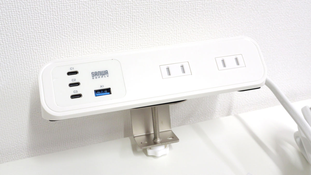 デスクを挟むようにして固定できるクランプ式の電源タップです。サンワサプライから提供してもらいました。