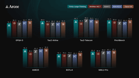 以下のグラフは、各種ベンチマークにおける性能をTrinity-Large-Thinking(緑色)・MiniMax-M2.7(赤色)・GLM-5(灰色)・Kimi-K2.5(青色)・Claude Opus 4.6(オレンジ色)で比較したもの。Trinity-Large-ThinkingはオープンウェイトモデルであるMiniMax-M2.7やGLM-5といったモデルに匹敵する性能を見せたほか、自律的なエージェントタスクに関するベンチマークのPinchBenchでは、市場をリードするクローズドモデルであるClaude Opus 4.6に次ぐスコアを記録しました。