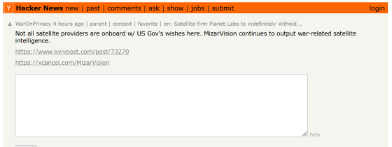 Not all satellite providers are onboard w/ US Gov's wishes here. MizarVision con... | Hacker News
