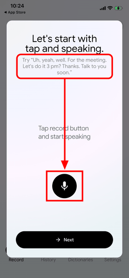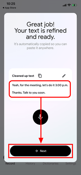 できるだけ原文に忠実に、「Uh」や「well」なども丁寧に発音したところ、自動でテキストのクリーンアップが行われ「Yeah, for the meeting. let's do it 3:00 p.m. Thanks. Talk to you soon」ときれいなテキストに整えられました。「Next」をタップします。
