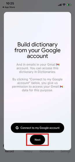 Googleアカウントと接続することで自分のアカウント内のデータから辞書を作成できるとのこと。今回は接続せずに「Next」をタップしました。