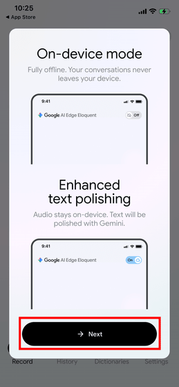 音声認識は常にローカル環境で行われますが、テキストのクリーンアップはクラウドとローカルのどちらで処理するかを選択可能とのこと。右上のスイッチが「Off」であればローカルで全ての処理が完結することになります。「Next」をタップ。