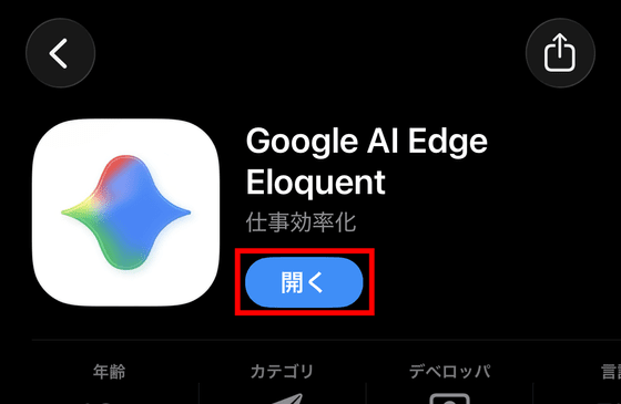 iPhoneでApp Storeの「Google AI Edge Eloquent」のページを開き、インストールして「開く」をタップします。