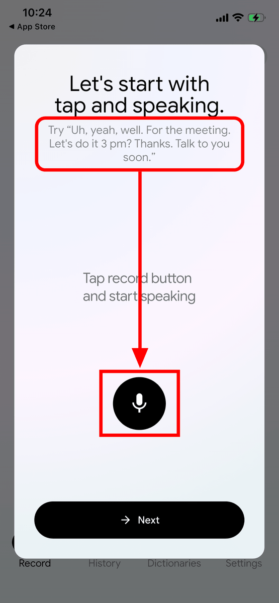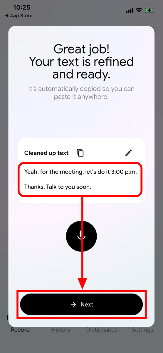 できるだけ原文に忠実に、「Uh」や「well」なども丁寧に発音したところ、自動でテキストのクリーンアップが行われ「Yeah, for the meeting. let's do it 3:00 p.m. Thanks. Talk to you soon」ときれいなテキストに整えられました。「Next」をタップします。