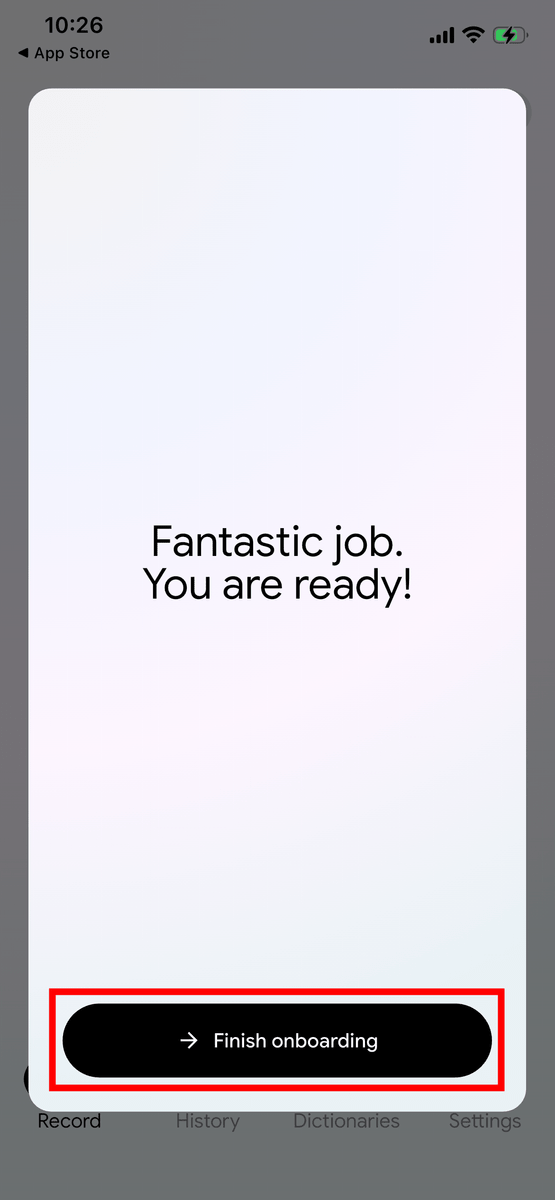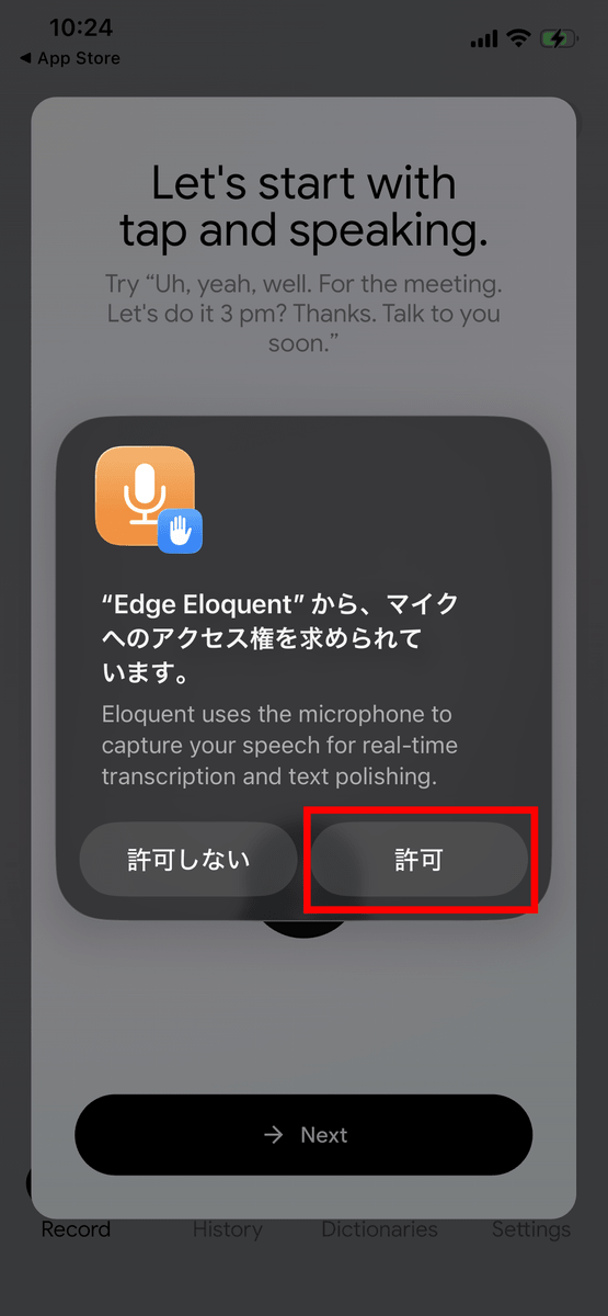 音声認識は常にローカル環境で行われますが、テキストのクリーンアップはクラウドとローカルのどちらで処理するかを選択可能とのこと。右上のスイッチが「Off」であればローカルで全ての処理が完結することになります。「Next」をタップ。