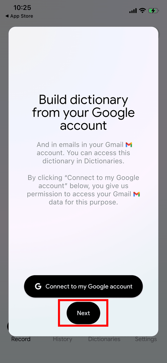 Googleアカウントと接続することで自分のアカウント内のデータから辞書を作成できるとのこと。今回は接続せずに「Next」をタップしました。
