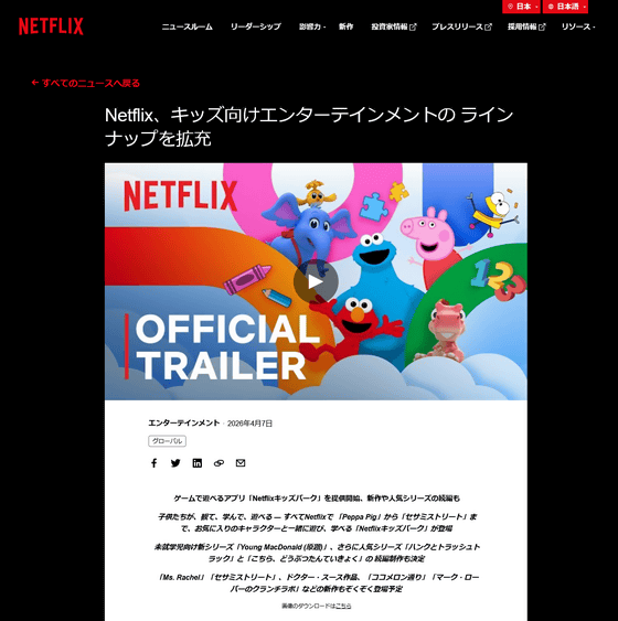 Netflixは「世界を愛される作品の世界観をさらに広げていくことで、好奇心と探究心を育む冒険の世界を提供し、成長ステージに応じて子どもたちを引きつける体験を作り出していきます」とコメントしています。