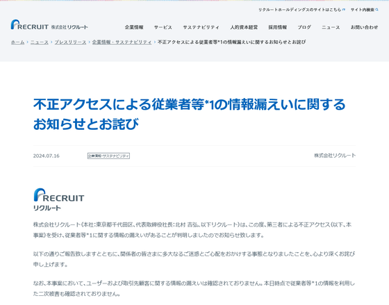 不正アクセスによる従業者等*1の情報漏えいに関するお知らせとお詫び | 株式会社リクルート