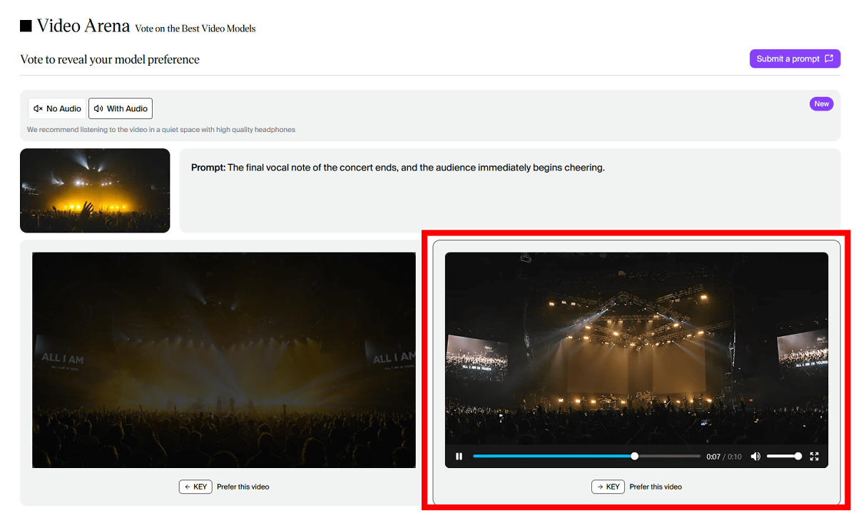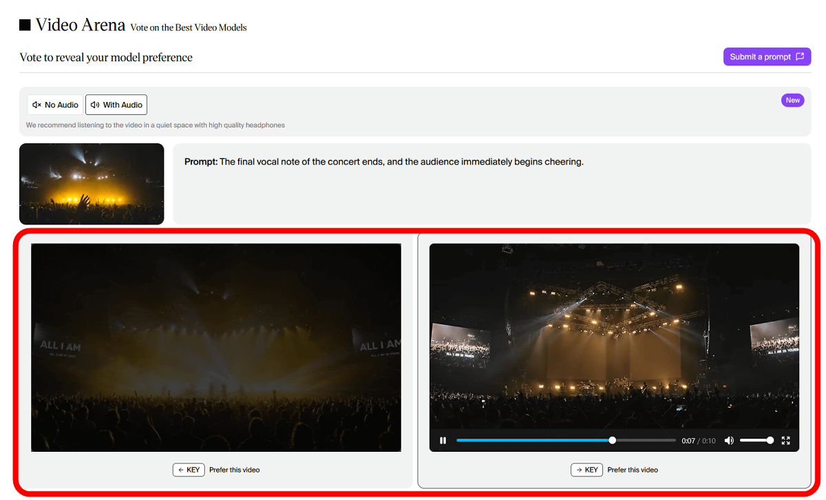 Artificial Analysisは「Video Arena」という動画生成AIランキングを運営しています。Video Arenaにアクセスすると同じプロンプトをもとに2種類のモデルで生成した2本の動画が表示され、ユーザーは両方の動画を再生して「プロンプトに忠実で高品質」と感じた方に投票します。動画生成時には「どのAIモデルで生成されたか」という情報が表示されず、モデルの名前を伏せた状態で「人間が高品質と感じた動画生成AIモデルのランキング」を作れるという仕組みです。