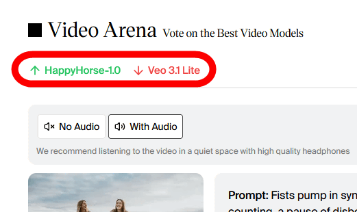 投票すると、画面右上にモデル情報が表示されます。今回のテストは投票した方の動画が「HappyHorse-1.0」、投票しなかった方の動画が「Veo 3.1 Lite」で生成されていたということが分かります。Video Arenaではこんな感じにユーザーの投票が蓄積してランキングが決定していきます。