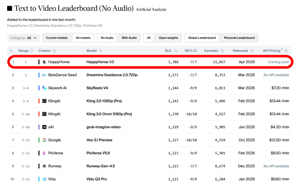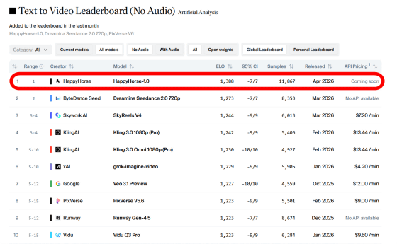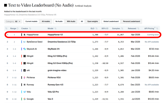 記事作成時点ではHappyHorse-1.0が「テキストから無音声動画を生成する」というカテゴリでGoogleのVeoシリーズやByteDanceのSeedanceシリーズを上回って1位になっています。
