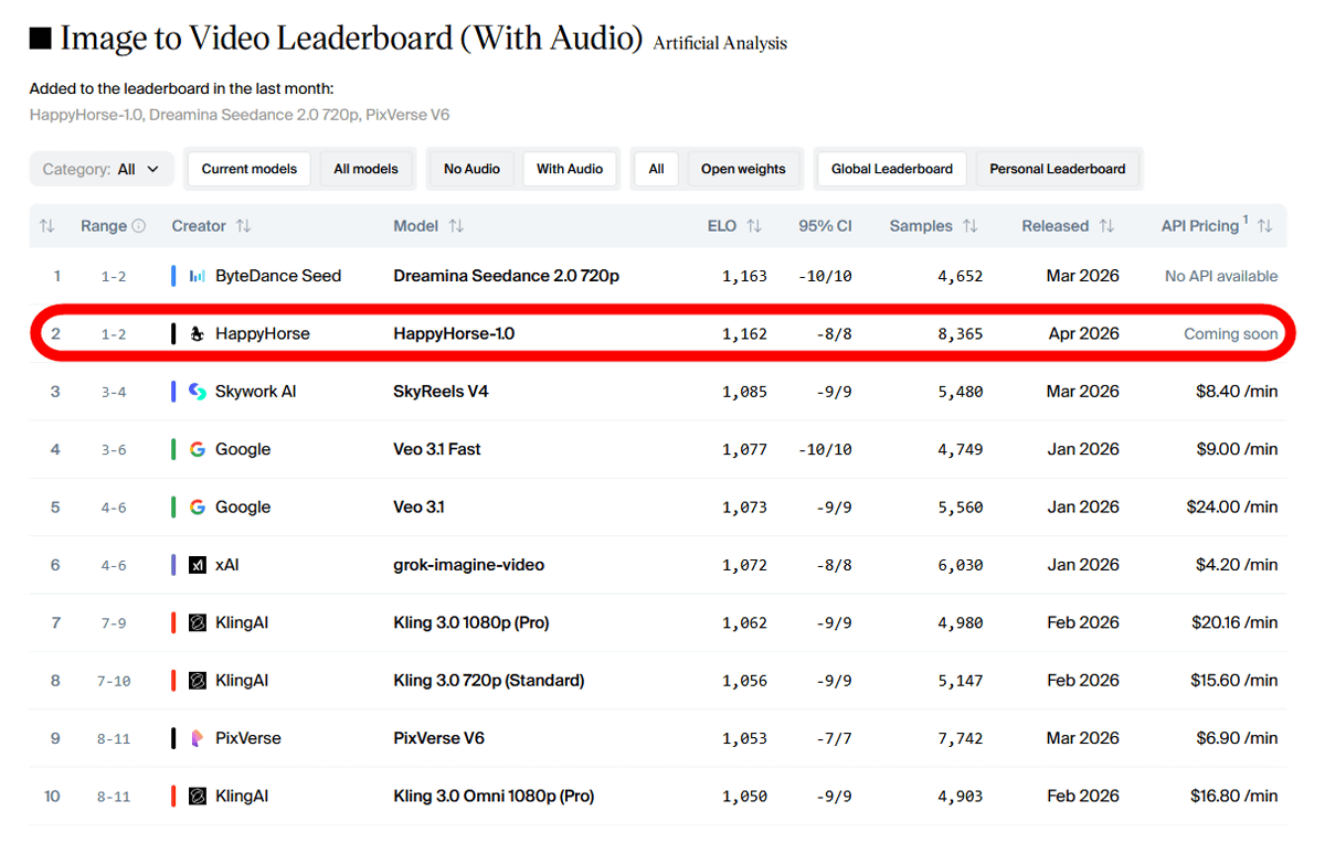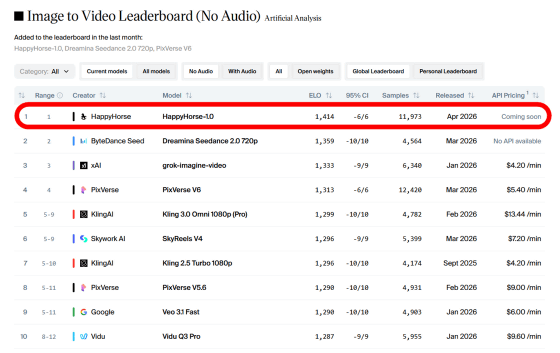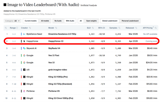 AI情報分析サイト「Artificial Analysis」の動画生成AI性能ランキングに「HappyHorse-1.0」という名前のモデルが登場し、GoogleやByteDanceなどの高性能モデルを抜いてランキング1位の座を獲得しました。