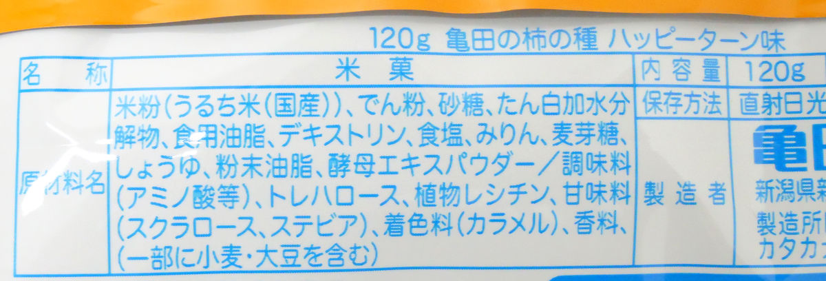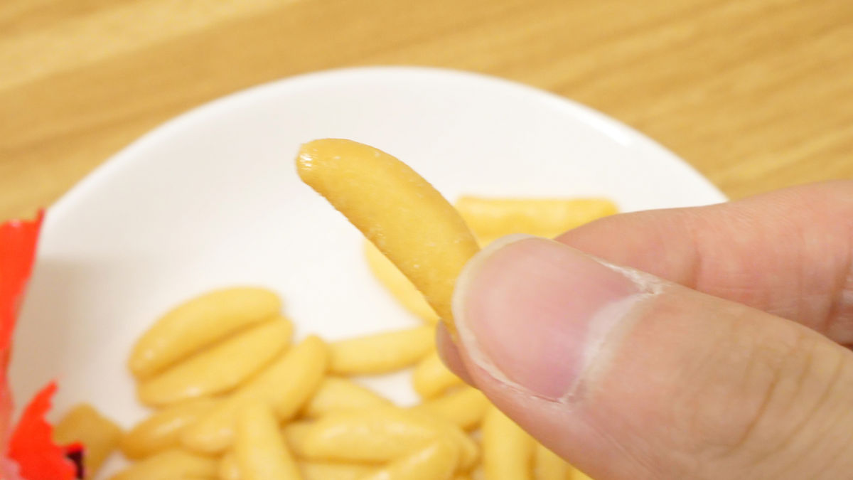 中身はこんな感じ。柿の種の見た目ですが、色はハッピーターンに寄った黄色っぽい感じ。