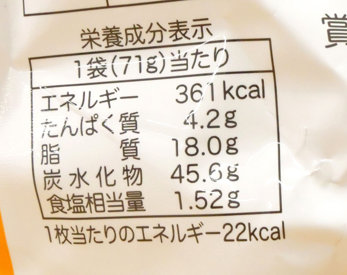 カロリーは100g当たり391kcal。1袋120gなので1袋当たりだと469.2kcalです。