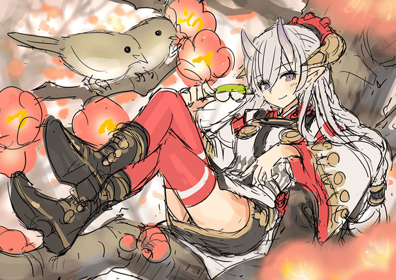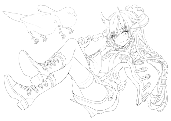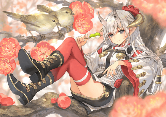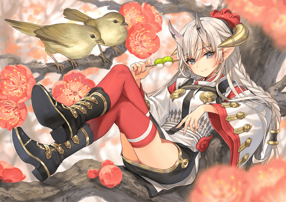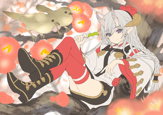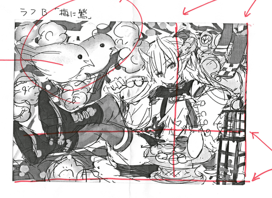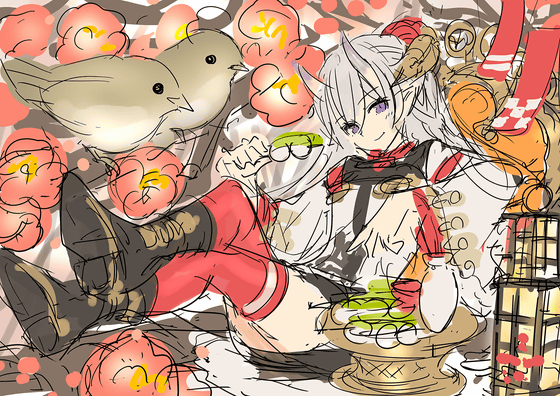 As for the overall composition, `` composition parallel to the horizontal and vertical lines of the screen '' or `` composition overlapping the diagonal of the screen '' is more monotonous than the whole illustration, because the parallel lines and diagonal lines are more noticeable May be received. Especially in GIGAZINE, I often see it on a small screen of a smartphone, and I asked you to change the pose from parallel lines to improve the overall impression even with small images. For the same reason, in order to make elements that are easy to get messy on small screens such as plum blossoms and various accessories clear, and to make it easier to understand `` illustration of who is doing what '' without explanation , We chose to focus on the elements of 'girl of demon', 'ume tree' and 'warbler'.