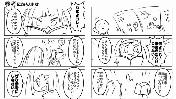 In the image below, the left is the initial name and the right is the changed name. In order to increase the persuasiveness of the line 'It's no good at all!', First display a note full of graffiti. And, for some reason, I put in a confident Yuhi for the graffiti. By doing this, the gag element is reinforced after showing the point that 'it is useless to take notes'.