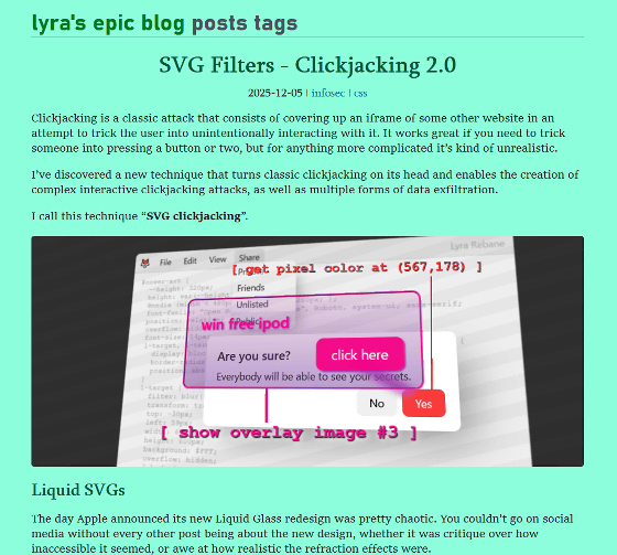 A few days after creating this demo, Rebane wondered whether the SVG effect that replicates Liquid Glass would work on an iframe (inline frame element). He tried it out and found that the Liquid Glass effect, which uses an SVG filter, works on an iframe. Because this effect can change the color and move pixels, he wondered if it could be used for some kind of clickjacking.