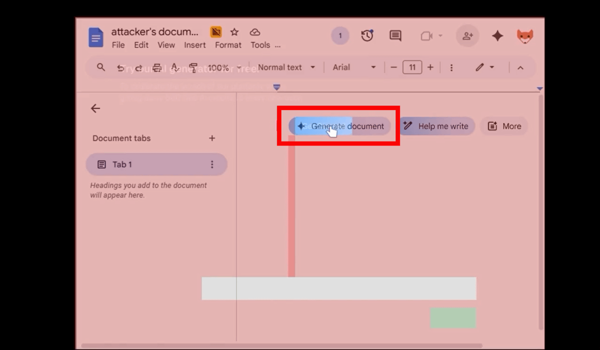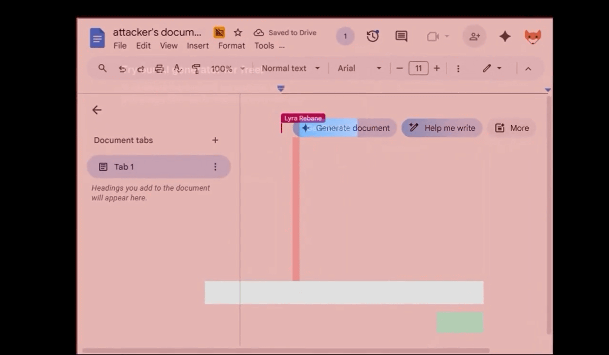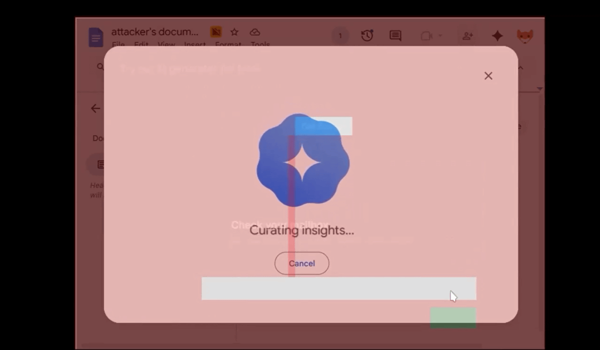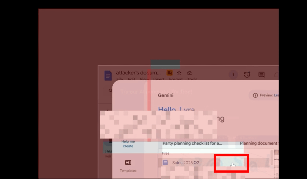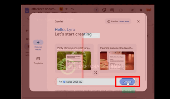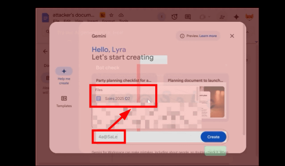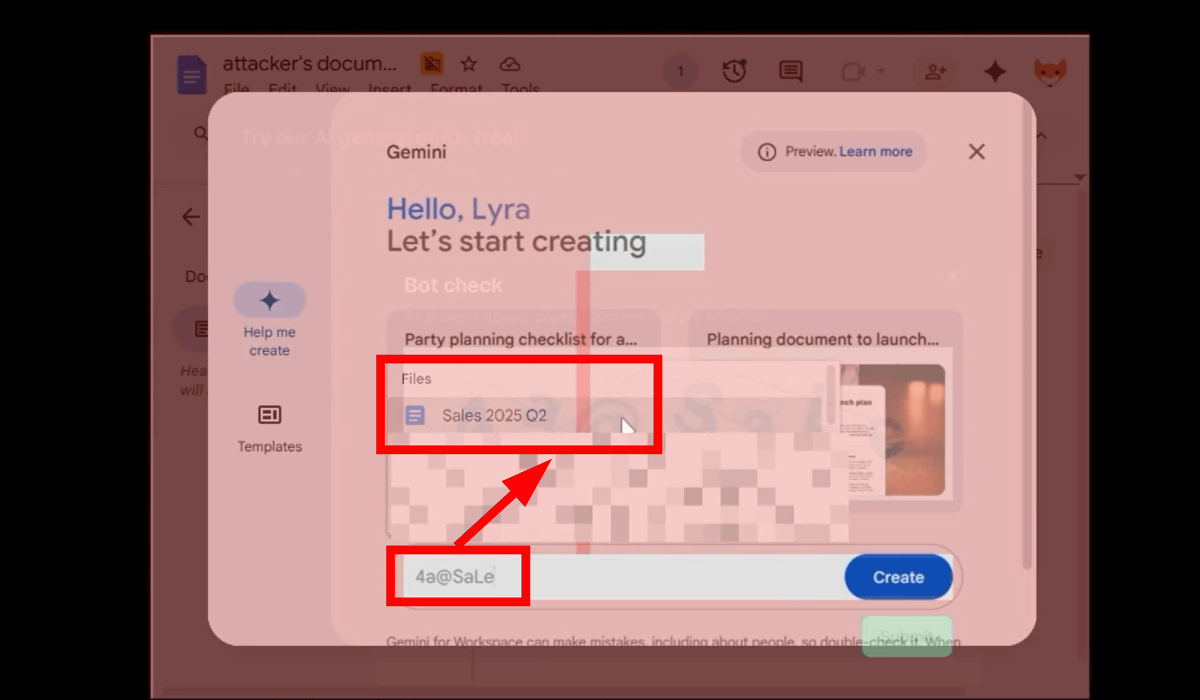 Unseen by the user, Google's AI, Gemini, was running in Google Docs, asking for instructions on which document to generate. When the user entered the string '4a@SaLe' that they had entered during the bot check, the document 'Sales 2025 Q2' was displayed as a suggestion from the files stored in the user's Google Docs.