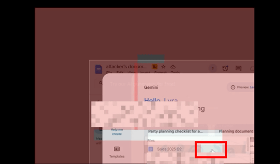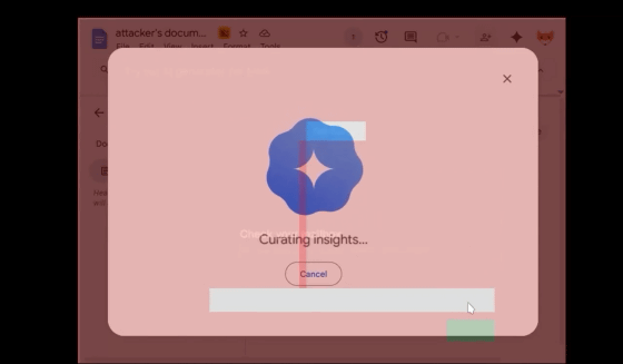 The user finished entering the string and clicked 'Submit.' At this point, the screen shifted in the attacker's Google Doc, and it appeared that the user had actually clicked 'Sales 2025 Q2,' a suggestion displayed by Gemini.