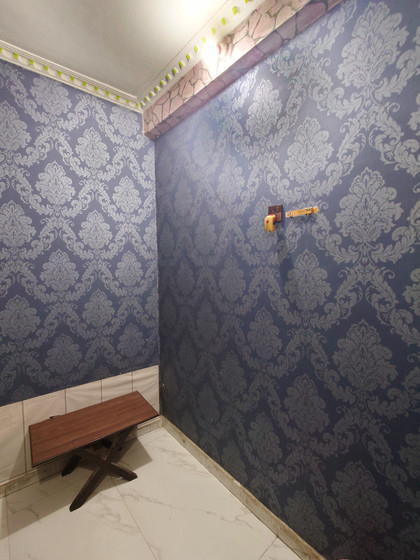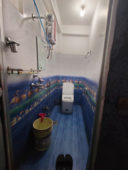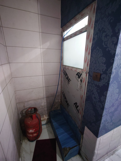 The bathroom, which is the room's most distinctive feature, is located at the back of the room. The bathroom is slightly elevated, and a red gas cylinder is placed under the stairs.