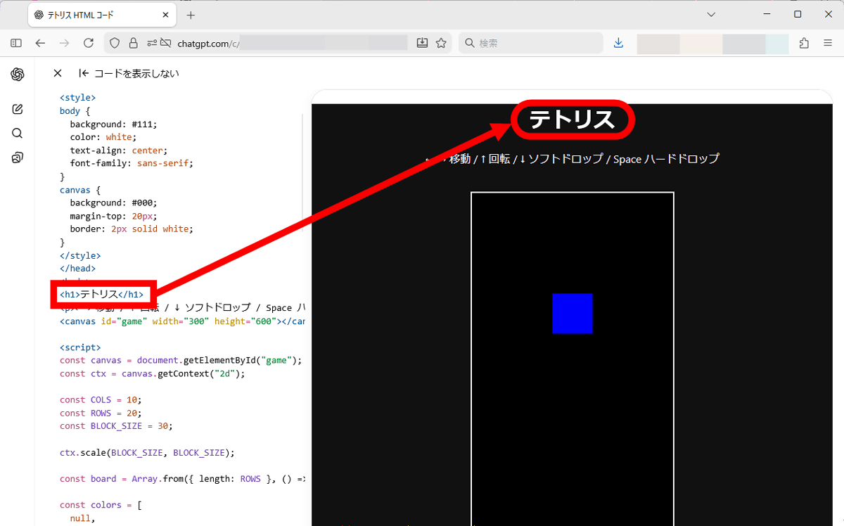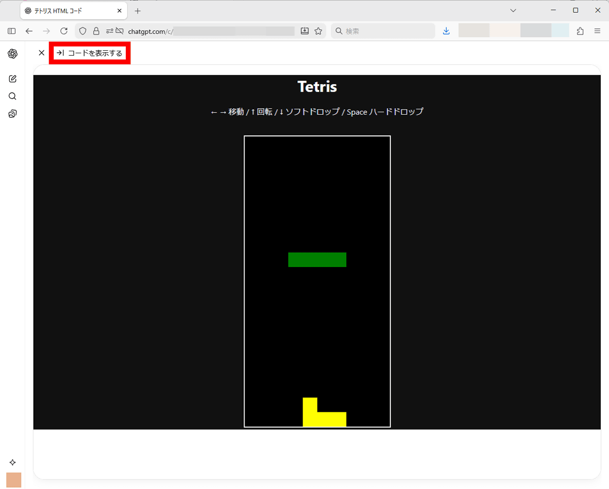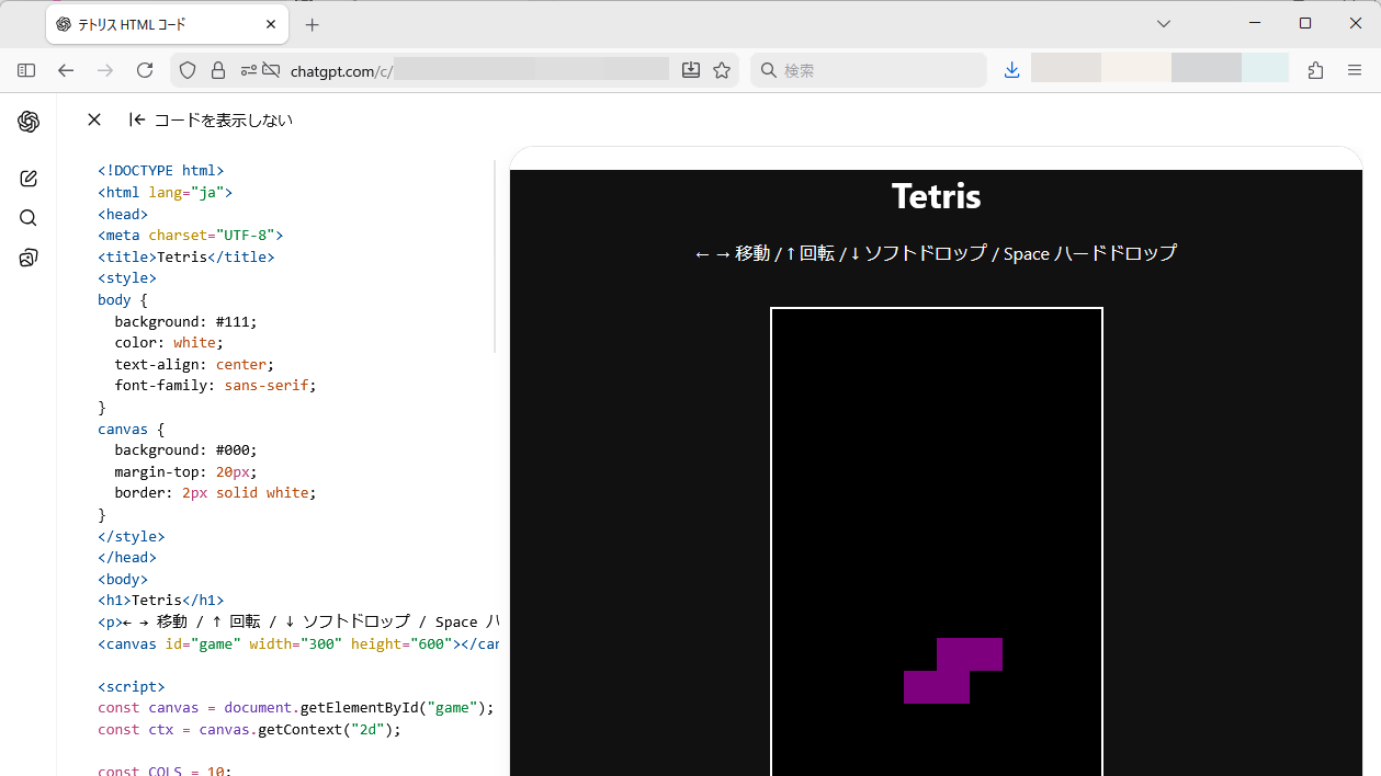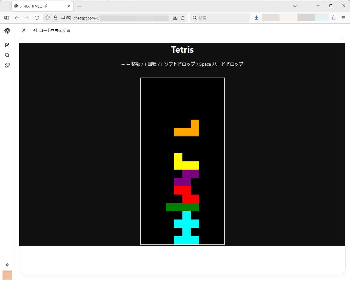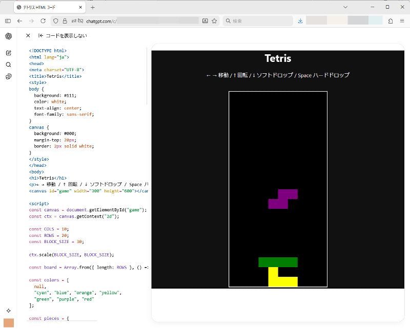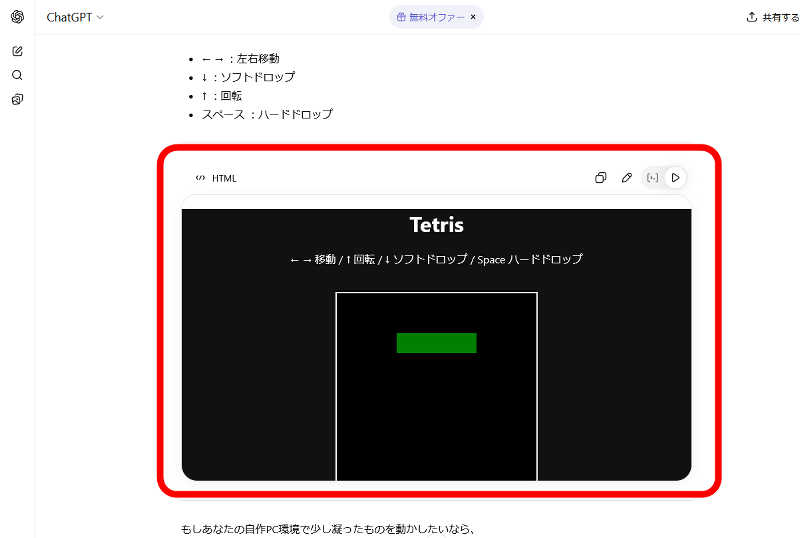 A large preview screen will be displayed within the ChatGPT screen. On this screen, you can actually play Tetris using the arrow keys.