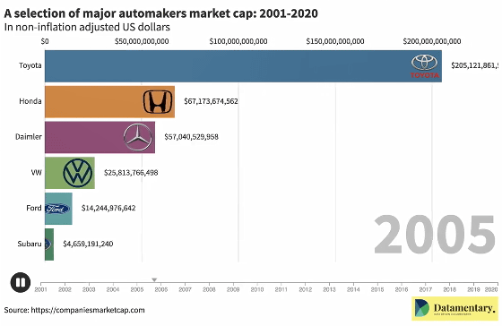 2001年の時点では、自動車メーカーの時価総額トップはトヨタの942億2800万ドル(約11兆3000億円)、2位がダイムラーの561億6100万ドル(約6兆7400億円)。3位以降はホンダ、フォード、フォルクスワーゲン、スバルと続きます。この時点ではテスラはまだ設立されていません。