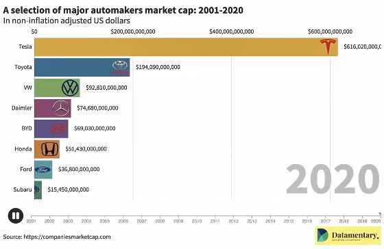 2020年12月9日の時点でテスラの時価総額は6160億ドル(約64兆1000億円)を超えており、世界の自動車メーカー全体を合わせた時価総額の3分の1を占めているとのこと。テスラの時価総額がどれほど急激に増加しているのかは、以下のムービーを見るとよくわかります。