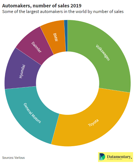 Datamentaryが「大手自動車メーカーの販売台数」を円グラフにまとめた図がこれ。テスラはBMWとフォルクスワーゲンの間に挟まれた青い部分であり、販売台数は多くの自動車メーカーに大きく差を付けられています。また、テスラの2020年の予想収益は280億ドル(約2兆9000億円)であり、これもフォルクスワーゲンの2990億ドル(約31兆1000億円)に遠く及びません。