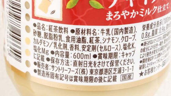 原材料は牛乳・砂糖・脱脂粉乳・食用油脂・紅茶・シナモン・クローブ・カルダモン。