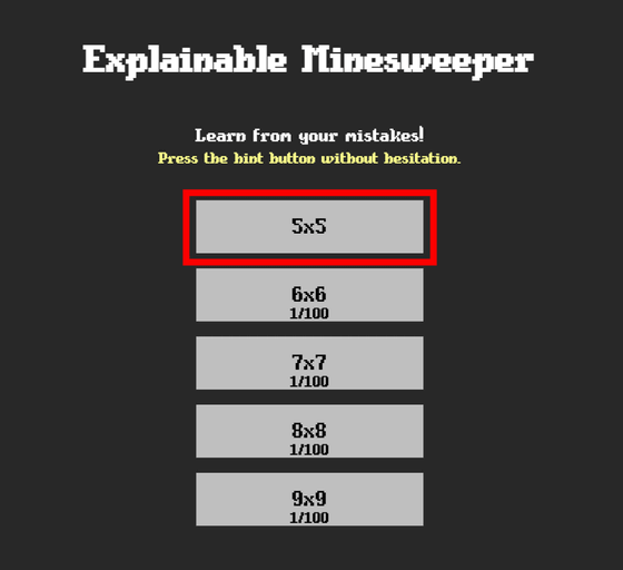 まずは盤面のサイズを選びます。用意されているのは「5×5」「6×6」「7×7」「8×8」「9×9」の5つ。とりあえず一番盤面の小さな「5×5」をクリック。
