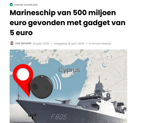 オランダ海軍のフリゲート艦「エヴァーツェン」に対し、郵便物にBluetoothトラッカーを仕込むことで、約24時間にわたって位置情報が追跡を行う事ができたとオランダの放送局「ヘルダーラント放送」が報告しました。
